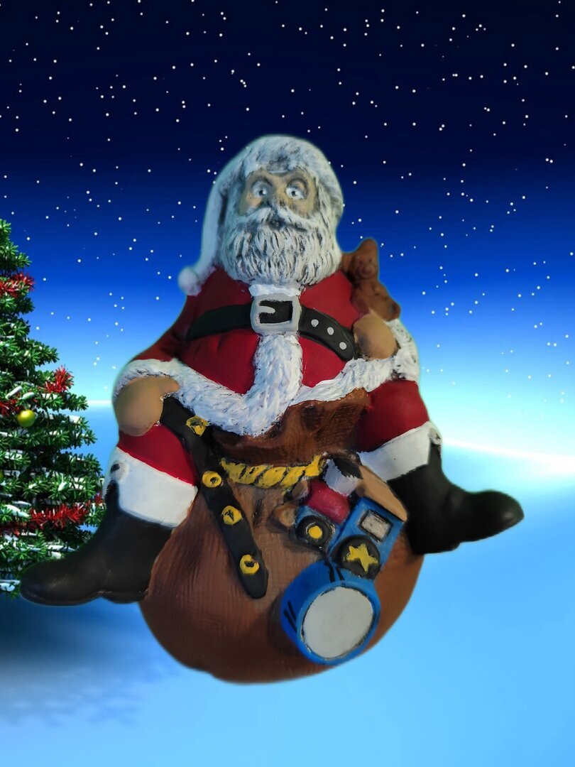 Ein niedlicher kleiner Weihnachtsmann, der lässig auf einem Sack sitzt - handgemalte Keramikfigur für festliche Dekorationen. 🎅🏼🎄